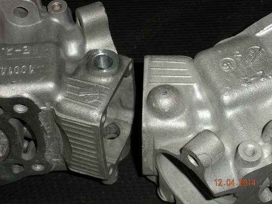 Per poter comandare le valvole con i cilindri affiancati (in origine sono a V) si e' reso necessario forare un lato dei cilindri per consentire, appunto, il passaggio dell'asse comando valvole. Si e' poi fresato il foro a misura e realizzato un supporto per un paraolio addizionale (A destra originale ed a sinistra forato e fresato)