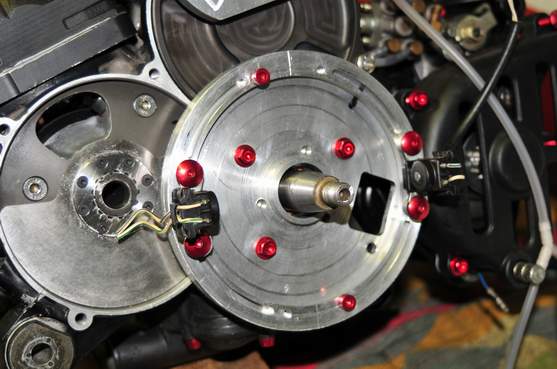 Per quanto riguarda l' impianto di accensione si e' optato per un volano e statore ex Yamaha TZR 250 per due motivi. Primo, essendo i volano piu' piccolo, e' piu' facile ricavare spazio per montare i carburatori da 35 che altrimenti non si possono montare con il suo volano originale, e secondo, avendo due pick-up e' molto versatile e piu facilmente interfacciabile con la Zeeltronic. Occorre pero' rifare il conico al volano nonche' una nuova sede per la chiavetta e tornire un piatto ad hoc con sede per il paraolio per montare lo statore